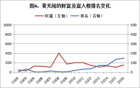 曾经主宰家电渠道的“北国美、南苏宁”两大霸主,掌舵人的财富轨迹却是截然不同。张近东2003年首次入榜时以5.8亿元的财富排在179位,2008年以财富峰值的351亿元排在第6位,及至2016年略降至319亿元,排在第44位(图3)。而国美黄光裕2003年首次入榜时即以46.8亿元财富排在第3位,同样在2008年以400亿元的峰值财富继续保持在第3位,及至2016年其财富下滑至150亿元,名次也下滑至第147位(图4)。