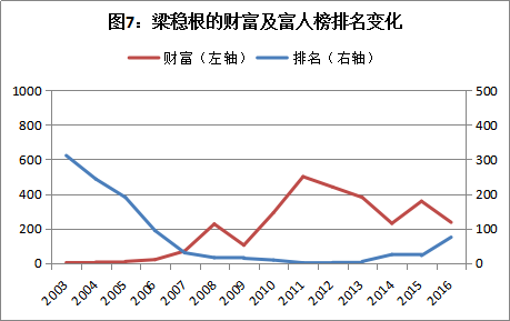 2003年,梁稳根仅以3亿元的财富排在第311位,此后他的财富数额一路走高,并在2011年以500亿元登顶首富。然而,这一励志故事好景不长,随着中国经济进入新常态,梁稳根在富人榜中的位次也一路下行,到2016年时已经跌落到第75位,财富数额也缩水过半(图7)。