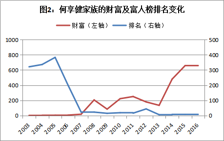 当然,在传统行业的富人也不乏逆袭的典型,比如何享健家族。2003年,何享健家族以2.7亿元的财富排在第321位,2016年则以685亿元财富飙升至第8位(图2)。其财富增速超出多数常青树,在于实现了三个主要跨越。一则,在电饭煲等日用家电市场渐趋饱和之时,美的及时切入到冰箱、空调等制冷家电市场爆发的新风口;二则,2013年美的实现整体上市,将旗下除地产之外的所有资产实现了证券化,何氏家族财富实现二级跳;三则,何享健与何剑锋父子联袂在金融领域耕耘,特别是何剑锋执掌的盈峰投资,已经成为何氏家族资本运作的另一主体,父子控制的金融资产据称已达千亿元规模。