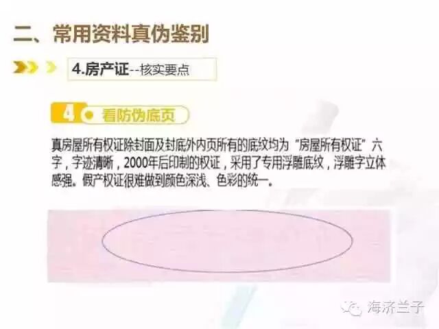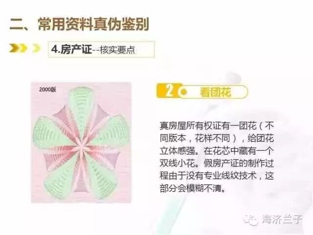 真房屋所有权证有一团花(不同版本,花样不同),真团花立体感强,在花芯中藏有一个双线小花;假房产证的制作过程由于没有专业线纹技术,这部分会模糊不清。