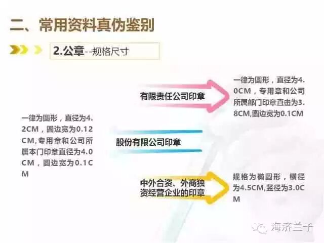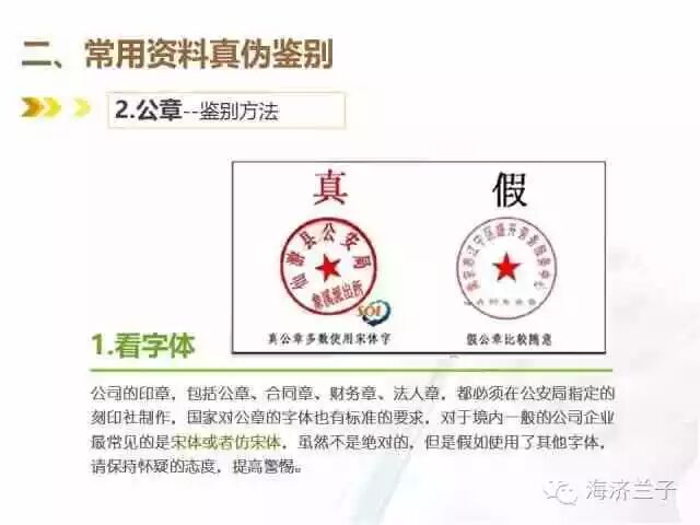 公司的印章,包括公章,合同章,财务章,法人章,都必须在公安局指定的刻印社制作,国家对公章的字体也有标准的要求,对于境内一般的公司企业最常见的是宋体或者仿宋体,虽然不是绝对的,但是假如使用了其他字体,请保持怀疑的态度,提高警惕。