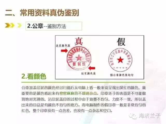 指的是盖章的角度,虽然绝大多数人盖章的时候都希望把章盖的很正,但是总会出现一点点偏差,特别是圆形的印章更不好把握。但是电脑制作印章时默认情况下肯定100%是正的,虽然印章盖的正与不正并不能判断印章的真假,但是作为一条判别假印章的线索,请大家综合运用。