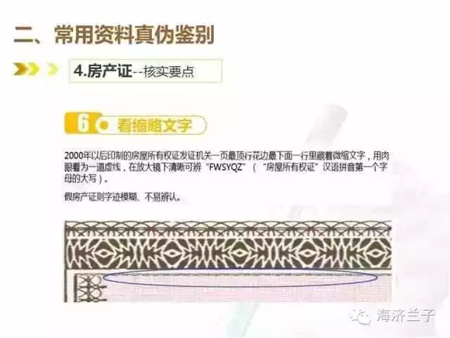 2000年以后印制的房屋所有权证发证机关一页最定行花边最下面一行里藏着微缩文字,用肉眼看为一道虚线,在放大镜下清晰可辨“FWSYQZ”(“房屋所有权证”汉语拼音第一个字母的大写);假房屋所有权证字迹模糊,不易辨认。