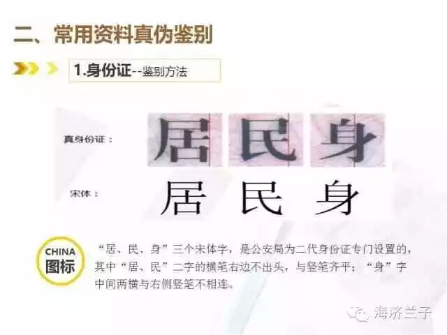“居、民、身”三个宋体字,是公安局为二代身份证专门设置的,其中“居、民”二字的横笔右边不出头,与数笔齐平;“身”字中间两横与右侧竖笔不相连。