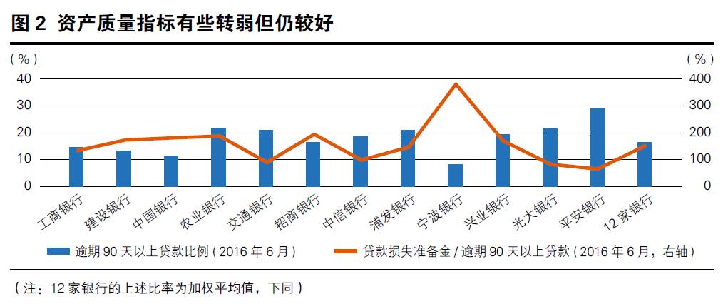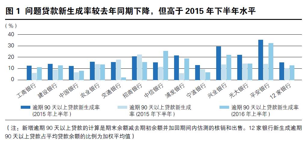 12家银行(包括中国工商银行、中国建设银行、中国银行、中国农业银行、交通银行、招商银行、中信银行、上海浦东发展银行、宁波银行、兴业银行、中国光大银行和平安银行)新增逾期90天以上贷款占平均贷款总额的比例从2015年下半年的1.05%增至2016年上半年的1.29%,增幅为24个基点,显著高出同期不良贷款率4个基点的平均增幅(从1.65%增至1.69%)以及关注类贷款率12个基点的平均增幅(从3.43%增至3.60%)。