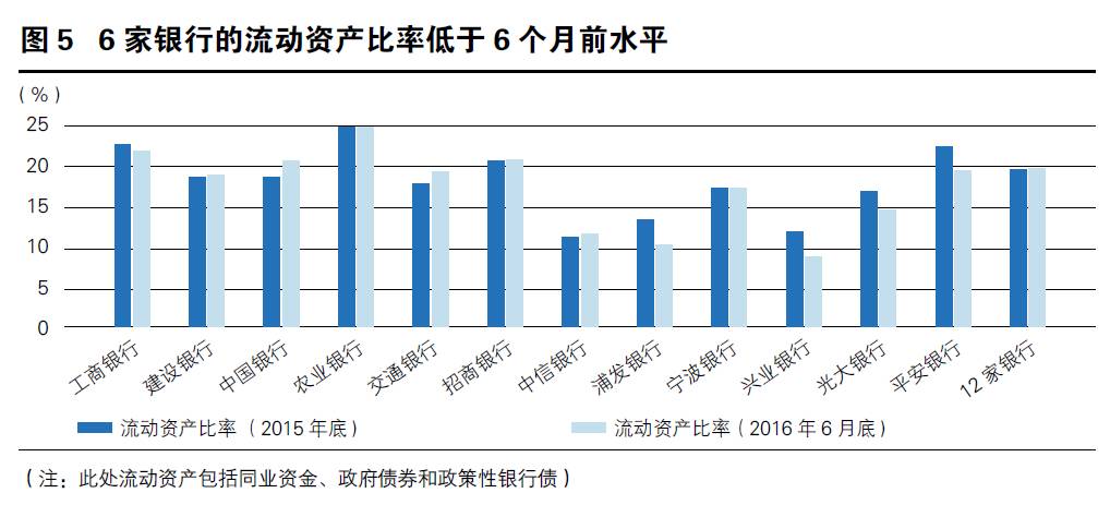 2016年上半年,12家银行使用的3个月内到期批发资金在总资产中的占比下降了一个百分点。考虑到其总资产规模,1个百分点的下降幅度已经不小。