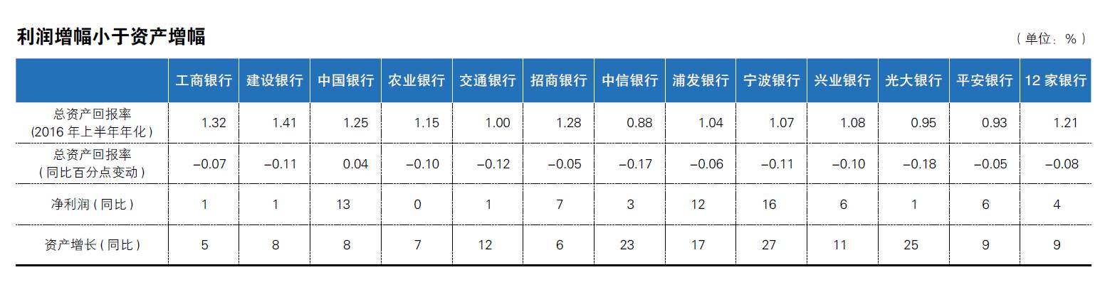 在12家银行中,10家银行的净息差下降,主要反映了人民银行降息之后资产负债的重新定价。此外,2016年5月开始营业税改征增值税,税改使得利息收入和运营费用双双下降。12家银行的净息差平均下降24个基点,从2015年上半年的2.48%降至2016年上半年的2.24%。鉴于净利息收入仍占其总收入的70%左右,若没有资产的快速增长很难实现利润增长,如上表所示。