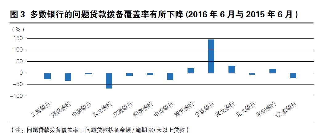 尽管持续疲软,但指标尚在可控范围内。获益于问题贷款的核销和出售,2016年6月底,12家银行逾期90天以上贷款余额占贷款总额的比例处于0.85%-2.91%的低位,如图2所示。此外,银行的问题贷款拨备覆盖率依然良好。2016年6月底,除平安银行之外,所有银行的贷款损失拨备覆盖了100%以上的逾期90天以上贷款。但是,12家银行的平均拨备覆盖率从去年同期的182%降至163%。