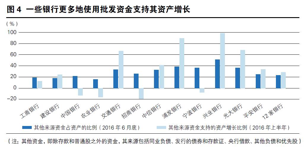此外, 2016年6月底,包括中信银行、浦发银行、兴业银行和光大银行在内的4家银行的调整后贷存比高于100%,显示上述银行依赖于批发融资支持其低流动性资产。