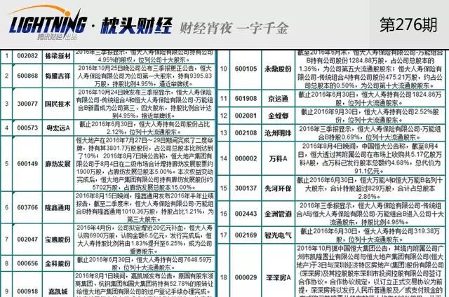 【恒大系】说完宝能系再来看看近来风头最劲的恒大系。恒大系主要通过恒大地产和恒大人寿投资A股。截止到11月30日,恒大共计持有15.532亿股万科A股,占万科已发行总股本的14.07%,累计耗资362.73亿元人民币。除了买入万科,恒大系在第三季度共新进入梅雁吉祥、国民技术、金洲管道和沧州明珠等4只个股,同时退出华帝股份、亿利洁能、中信海直和御银股份等4只个股的十大股东行列,目前共持有23只个股,保守估计,持股市值合计达到500亿元左右。