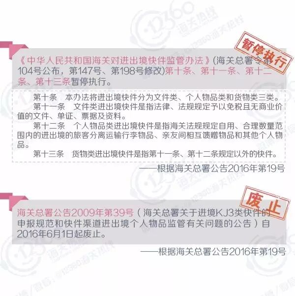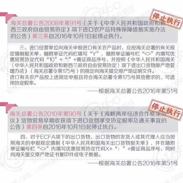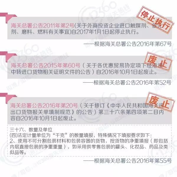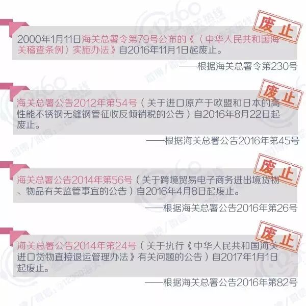 自2016年1月1日至2016年12月31日,海关总署共发布公告90个,署令1个。在新政策开始实施的同时,很多之前已发布的署令、公告、条款也被废止或停止执行了。小编把这些已经不再有效的署令、公告、条款帮大家整理了出来,提醒大家在查阅文件的时候注意文件的有效性哦!