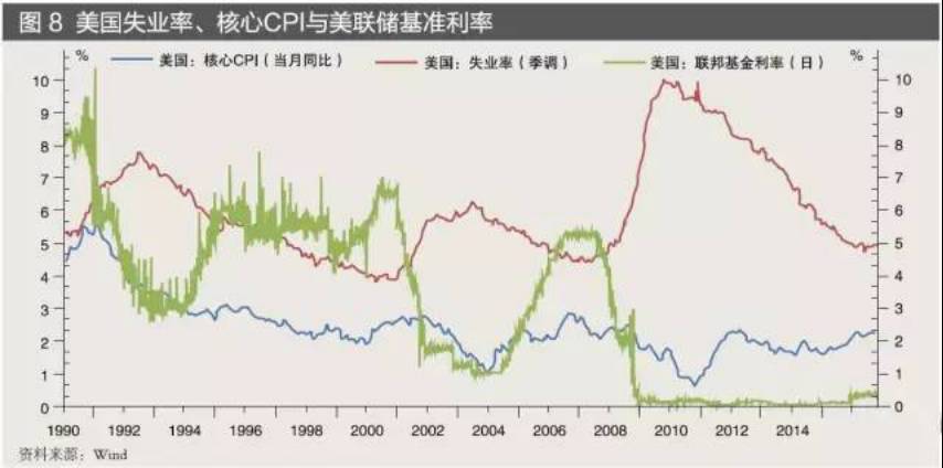第一,美联储加息进程加快。美联储是否加息及其幅度,影响着投资者信心、资本流向、美元价值、融资成本、大宗商品价格、汇率变动等等,是全球金融市场波动的主线。2016年三季度,美国经济基本转暖:GDP初值环比增长折年率为3.2%,增速创2014年三季度以来最高;制造业PMI指数9月再次回归荣枯线以上,达51.5;核心CPI同比增长率为2.2%;新增非农就业人数15.6万人,失业率为5%,处于相对低位(见图8)。这些数据为美联储12月加息提供了支持。而2017年1月特朗普上台后,根据其竞选期间对低利率政策的批评,很可能会更换美联储主席,施加政治压力推动美联储加快加息进程。这将引发全球金融市场新的震荡。