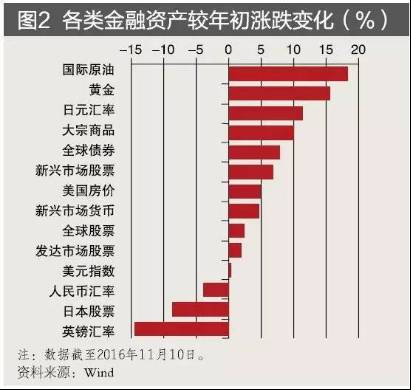 因此总体来看,在意外事件频出和更加强健的治理力量的共同作用下,2016年国际金融市场虽动荡加剧,但波澜不惊。芝加哥期货交易所(CBOE)市场波动性指数处于30以内,虽高于2013—2014年相对稳定的期间,但远低于2008—2009年金融海啸期间,也低于2012年欧债危机期间(见图1)。以各类金融资产或金融投资标的投资回报率来衡量,2016年国际金融市场在动荡中有所回升,表现相对稳健(见图2)。
