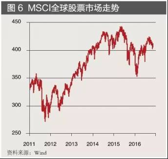 股票市场震荡回升。全球股票市场遭遇了2015年末2016年初的大幅回调之后,2016年总体呈现一定程度的反弹。但是,由于缺乏实体经济强劲复苏的基石,靠流动性支撑的反弹不具有可持续性,容易受到外部风险的冲击。英国脱欧公投和美国大选两个“黑天鹅”事件就引发了全球股市的巨幅波动(见图6)。