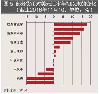 外汇市场表现呈现较大差异。美元虽有加息及升值预期,但整体上美元指数处于95—100的波动调整区间,年末与年初相比的变化不大。不过,在美元升值预期和其他地区波动不断的影响之下,全球外汇市场差异巨大。其中,日元、瑞郎等避险货币相对美元呈升值态势,而欧元、英镑则因为欧洲经济疲软、英国脱欧公投等问题而大幅贬值;在新兴市场,人民币、土耳其里拉、墨西哥比索等因为各自原因而出现贬值态势;而俄罗斯卢布、巴西雷亚尔、南非兰特等货币因上一年贬值过多且大宗商品触底反弹,2016年呈现较大幅度的升值(见图5)。