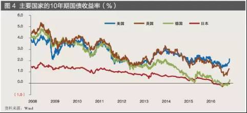 全球利率水平在历史低位徘徊。由于经济增长疲软,通胀水平较低,发达经济体央行政策利率处于接近于零的水平(见图3),甚至实施负利率政策;各国长期国债收益率持续在历史低位徘徊。2015年底,美联储的首次加息仍然是象征性的,幅度有限,并未改变全球低利率的现状。不过,2016年下半年以来,随着大宗商品价格企稳回升,美联储再次加息预期升温。以10年期国债收益率为代表的长期利率也随之有所回升(见图4)。