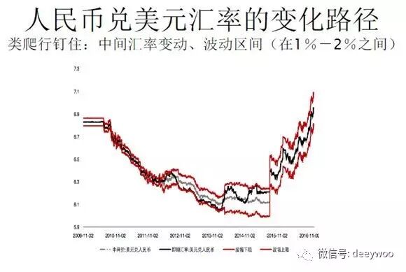 2010年10月之后,人民币开始走向对美元升值的过程。2015年8•11汇改,人民币对美元一下子贬值,从那之后人民币对美元在波动中不断贬值,这是目前的状况,现在差不多6.9左右。这里面大家需要注意什么?人民币对美元的中间价先是升后来是贬,这段时间这条灰线是不变的是水平的,说明这段时间是钉住美元的,以后对美元是在变化的,而且这个变化遵循某种规则。这个就是类爬行的特征之一,你必须是这样的叫类爬行,这是第一。