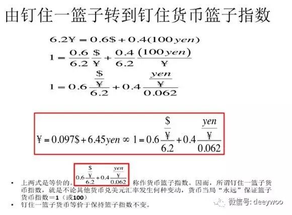 以上两个等式是等价的。左边以篮子货币来表示的,右边以篮子货币指数来表示的。右边这个等式的右边称作货币篮子指数,货币篮子指数等于多少?现在还不知道,你得知道了它们的汇率之后才知道,这就叫做篮子汇率指数。所谓钉住一篮子货币指数就是无论其他货币对美元汇率发生何种变化,货币当局永远保证篮子货币指数等于1或者100。钉住一篮子货币等于保持篮子货币指数不变或者钉住一篮子货币指数,这俩说的是一件事。