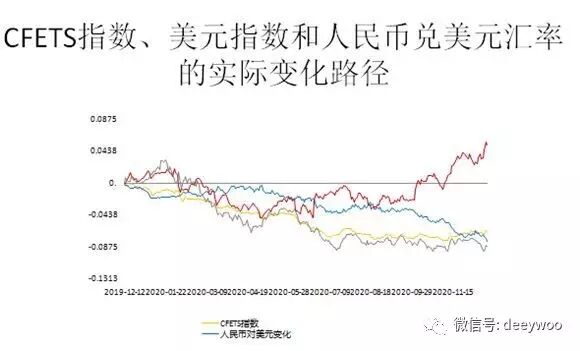 CFETS到底是怎么变化的,跟哪些因素有关?我们现在要考虑三个变量,人民币对美元的汇率、CFETS指数、美元指数,这三个变量之间是有关系的。如果人民币对美元汇率贬值,美元指数也下跌,那么CFETS一定是下降的。如果人民币对美元贬值,美元指数上升,CFETS可能升也可能降,取决于人民币对美元贬值的相对幅度,这是我们得出的结论。这个结论实际上是重要的,这是实际所看到的三个变量的变动路径。