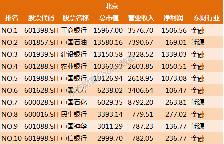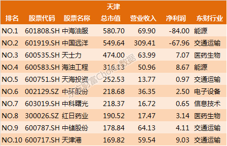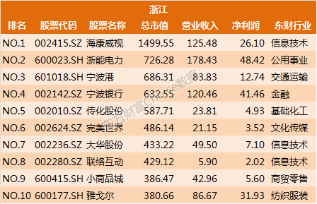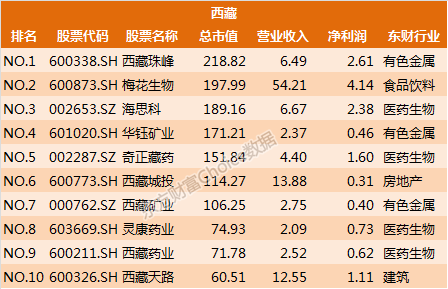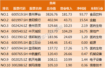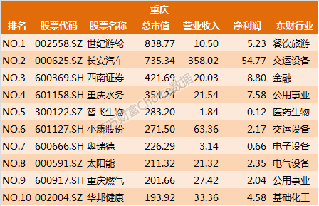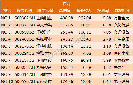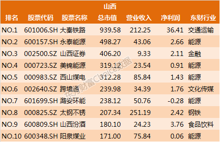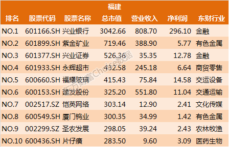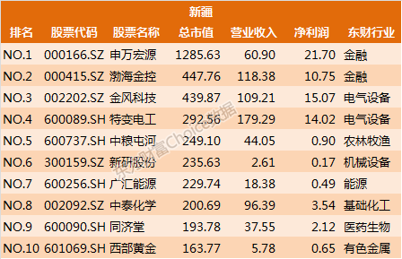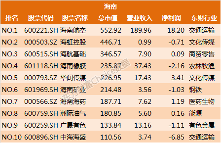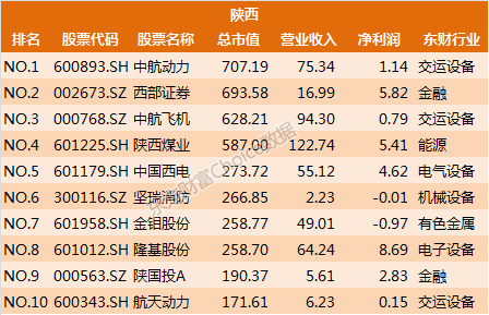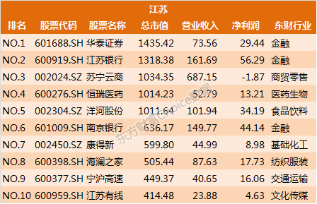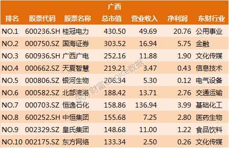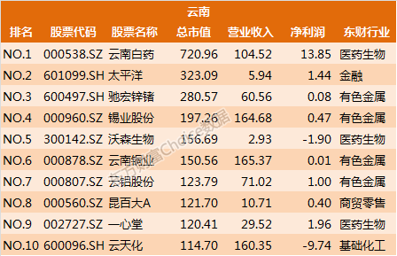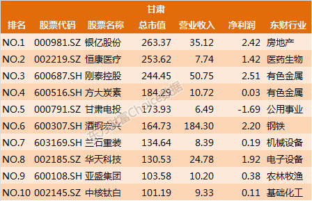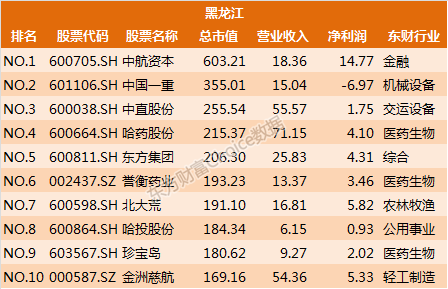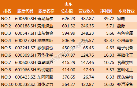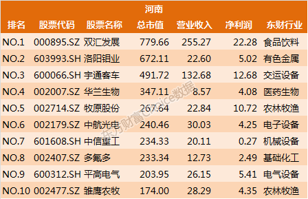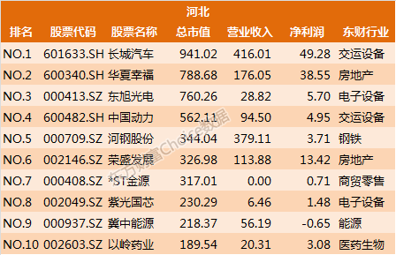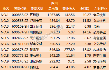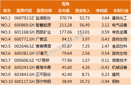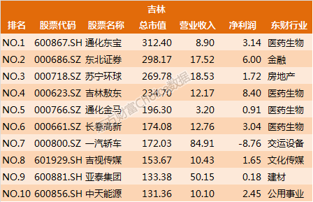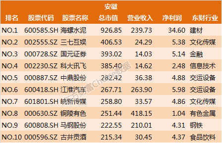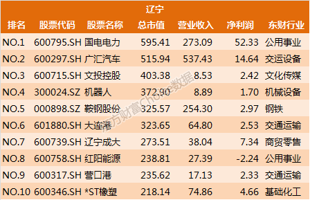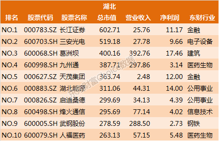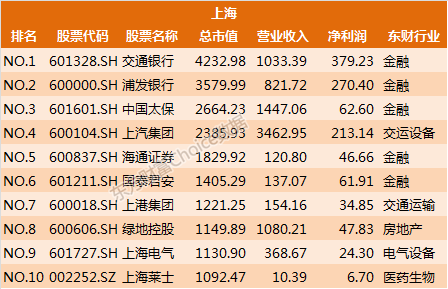 来源:东方财富各省上市公司十强名单系按照总市值排序,表单中营业收入及净利润数据均为2016年中报数据,单位为亿元。注:本文所提上市公司为沪