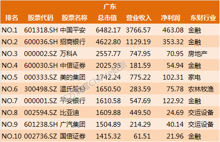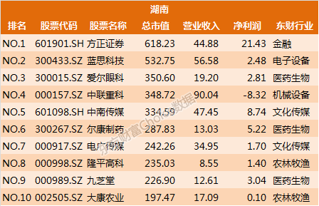 各省上市公司十强名单系按照总市值排序,表单中营业收入及净利润数据均为2016年中报数据,单位为亿元。