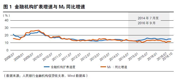 数据显示,2014年7月至2016年9月期间,M2平均同比增速为12.38%,而同期金融机构扩表增速则为14.66%,高出M2约2.3个百分点,如图1所示。从趋势上看,两者增速差由2014年年中的几乎为0已有所扩大,而当前的增速差达到近5年以来的峰值3.98个百分点。该增速差不断扩大,最直接的影响则是导致M2增速难以作为货币政策目标真实反映实际流动性释放规模。如若央行仅仅盯住M2目标增速,则可能导致货币政策与实际情况脱节。