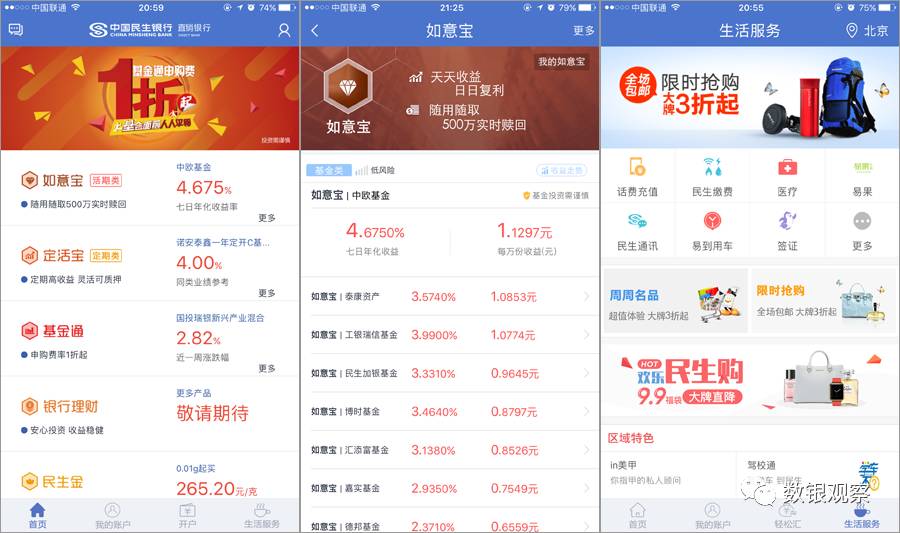 民生直销银行主推移动互联网渠道,这是其IOS版APP的部分截图: