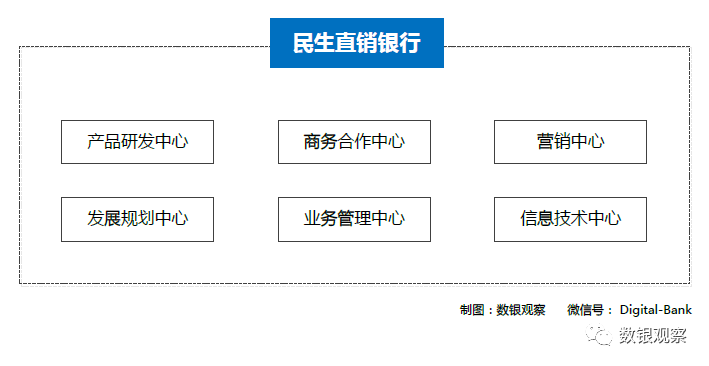 区别于本公众号此前介绍的微众银行、网商银行的例子,民生直销银行虽然定位于一家独立的银行,但组织架构上仍然受限于民生银行的部门体制,设有六大中心,其中信息技术中心是亮点,体现了一定的独立性。除了拥有自己的IT团队外,这一组织架构与国内其他较大体量的直销银行并无实质差别。