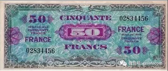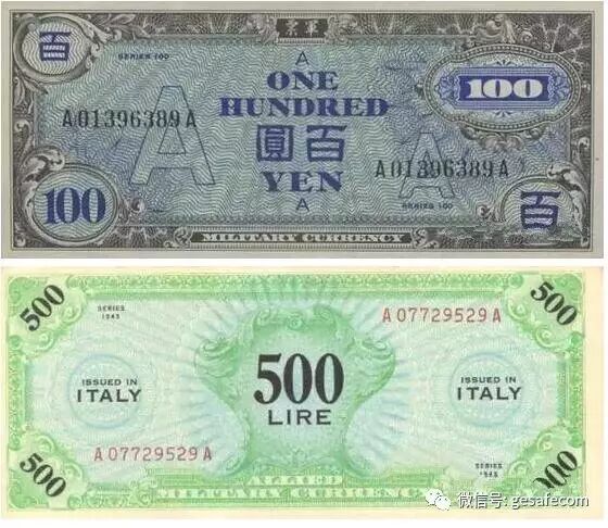 二战后盟军(美军)在法国、德国、日本、意大利发行的临时货币纸币,设计的很像简易版美元,充分显示了把握物资后的经济权力。美元就是依托这些高度依附的战后国家货币推开的
