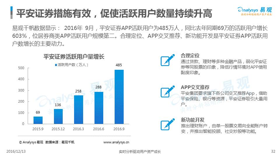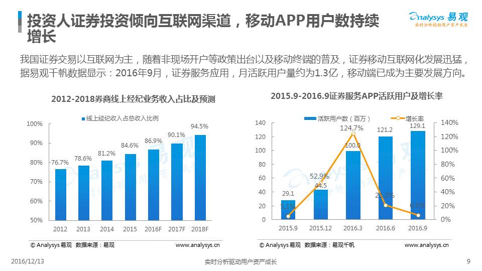 我国证券交易以互联网为主,随着非现场开户等政策出台以及移动终端的普及,证券移动互联网化发展迅猛,据易观千帆数据显示:2016年9月,证券服务应用,月活跃用户量约为1.3亿,移动端已成为主要发展方向。