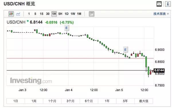 午后,离岸人民币兑美元升破6.8关口,现报6.8144,连破5大关口,收复多处失地。从1月3日到5日,人民币对美元最低点到最高点,涨幅近2000点。