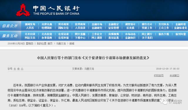 12月29日,央行、银监会等十四部门联合印发了《关于促进银行卡清算市场健康发展的意见》(银发〔2016〕324号,以下简称《意见》)。央行表示,进一步完善银行卡清算服务市场化机制,提升我国银行卡清算机构的国际竞争力,促进银行卡清算市场健康、持续发展,保障国家金融安全。