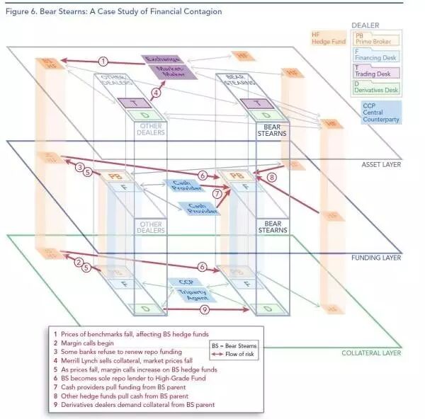 资产端带来的冲击不仅仅会影响负债端,同样会影响到自己的融资层(资产层→融资层),因为你可以将买入的资产质押出去,或者进行回购融资,而一旦你的资产价值下跌,你的债权人势必会要求增补抵押物(无论是现金还是债券),这就被称为“Margin Call”。在贝尔斯登的案例中,一些借款者拒绝对之前的回购融资进行回滚续期操作(rollover,到期续作)。更直观地讲,之前的赎回压力对于负债端而言可能是“retail run”零售投资者挤兑;而拒绝对回购融资进行续作那就是“institutional run”机构投资者挤兑了。