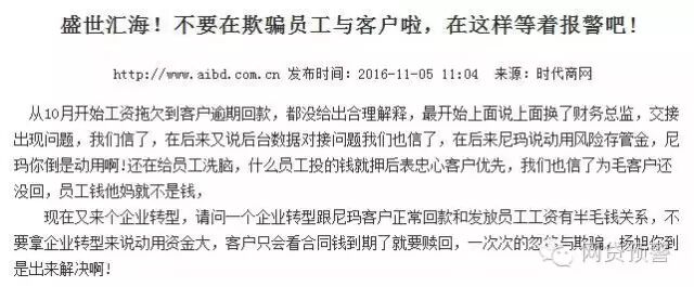 据媒体最新的报道,10月份,盛世汇海出现拖欠工资,客户逾期回款等问题,公司先后以更换财务总监、后台数据对接、动用风险存管金、企业转型等借口搪塞。