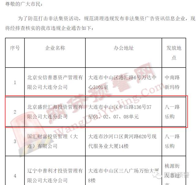 大连市处置非法集资办公室发布通告,当年共有36家企业违规发放涉嫌非法集资广告,其中名单第二位就是盛世汇海大连分公司。