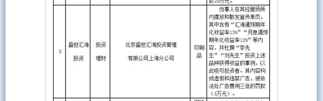 据媒体报道,2016年9月1日,上海市工商局公布12起典型虚假广告案例,其中第5起就涉及盛世汇海上海分公司,理由是虚构事例吸引投资者,“内容构成虚假和违禁广告”,处以5万元罚款。