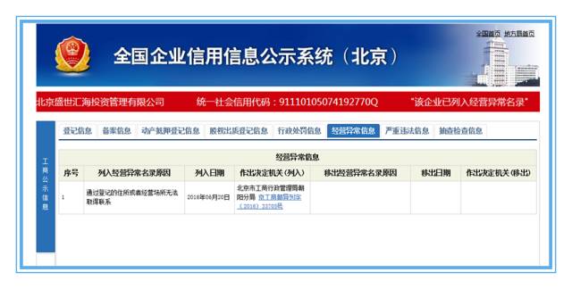查询发现,盛世汇海在今年6月20日被列入经营异常名录,原因是,通过登记的住所或者经营场所无法取得联系。