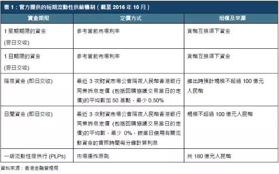 短期流动性方面,离岸市场的人民币资金供应管道分为官方及市场融资两个层面。官方提供的短期流动性,包括香港金融管理局(金管局)向市场提供的一日及一周期限流动资金安排(两者均为翌日交收),以及隔夜流动资金安排(即日交收);2014年为回应沪港通的开通,香港金融管理局又推出每日上限100亿元的拆借资金,以满足沪港通开放后离岸市场对人民币的即时需求。另外,还同时推出香港离岸人民币市场的一级流动性提供行(CNH Primary Liquidity Providers,简称PLPs)服务,由金管局为7间PLPs提供各20亿元人民币回购服务(repo facility),以支持扩展离岸人民币市场的庄家活动及其他业务。