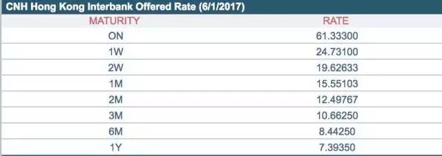 因为,昨天晚上香港市场的人民币隔夜拆借利率高达38%,人民币Hibor暴涨2139个基点。今天,香港离岸人民币隔夜Hibor暴涨2299.8个基点至61.333%,连续第二日暴涨。
