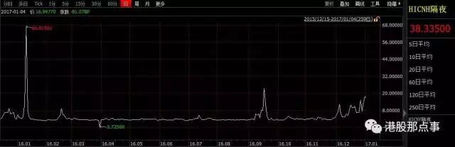 去年的1月12日,离岸人民币流动性紧张状况加剧,香港隔夜离岸人民币银行同业拆放利率(Hibor)由1月11日的13.4%飙升至66.8%,创有记录以来最高水平,一周、两周Hibor也分别升至33.79%、28.34%的纪录新高。