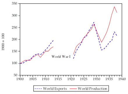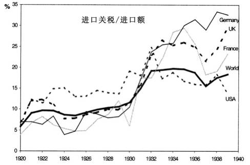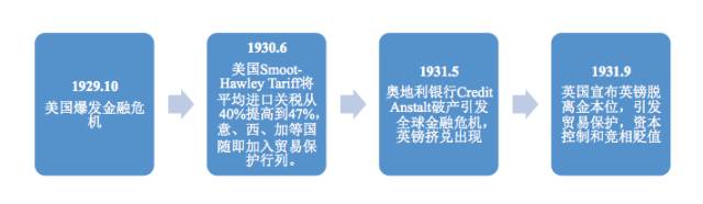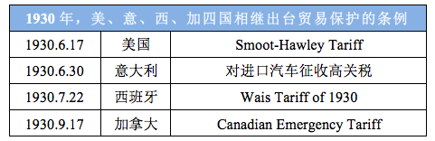 西方经济体的大萧条自1929年10月29日美国股市的崩盘开始,自1930年上半年美国经济已经在各个方面出现恶化。而由于当时金本位制度限制汇率的自由浮动,货币政策的独立性有限。因此当国家面临经济危机的时候倾向于使用贸易政策来保护国内生产和就业。自1930年6月美国推出Smoot-HawleyTariff法案,将平均进口关税从40%提高到47%(Eichengreen & Irwin,2009)开始,全球贸易保护措施就蔓延开来。美国的贸易保护法案出台引起了美国主要贸易伙伴的连锁反应。加拿大和部分欧洲国家随之出台相关的贸易保护条例。