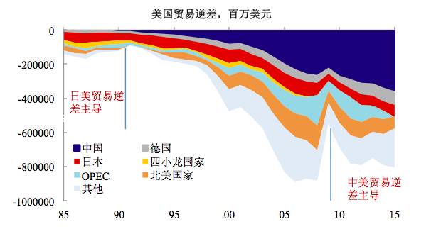 对于美国而言,80年代,美国贸易逆差中日本贡献了主要部分,从而引发了美日贸易冲突的不断加剧和美国对日本各方面的经济和贸易制衡。而2000年以来,来自中国的商品贸易逆差占据美国逆差的主要部分,现在美国的逆差中中国所占的比重已与80年代日本的水平相当。