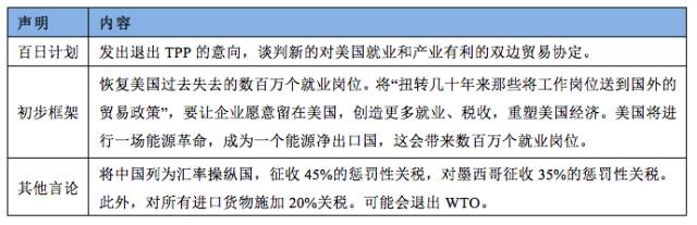 1)退出TPP:特朗普在百日计划中提出上任第一天就将退出TPP(《跨太平洋伙伴关系协定》);