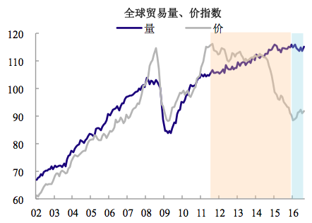 而全球商品贸易已转向缩量。2002年以来,全球贸易走势大致经历了3个阶段:1)2002年-2011年量价同向涨跌,全球经济持续增长(金融危机期间受到一定的负面冲击),推动贸易活动持续扩张,贸易量、价呈现同涨同跌走势;2)2012年-2015年价跌量涨,一方面全球需求增长放缓,而另一方面前期高增长阶段投入的产能逐渐开始释放,导致供给过剩的状况不断加剧,企业只能通过降价维持出口增速;3)2016年至今价涨量缩,商品贸易量进入绝对量的萎缩阶段,而同时出口价格水平从底部有所回升(或受大宗商品涨价影响),整体呈现出量缩价涨的新格局。在这种情况下,特朗普政府若采取贸易保护,则全球贸易量很可能会雪上加霜。