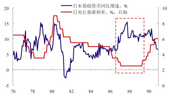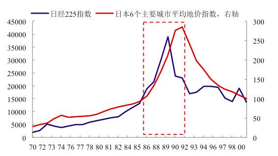 企业外移致日本产业空心化问题凸显,而过度依赖货币刺激,则引发了日本资产价格泡沫。在应对汇率升值造成的经济下滑期间,由于日本在财政重建的背景下选择了紧缩的财政政策,因此只能依赖日本央行采取宽松的货币政策以刺激经济,但由于经济受挫使得实体对资金的吸引能力不足,过度宽松的货币政策导致资金大量涌入房地产及股票等资产市场上。日本国内资产价格的快速上涨,并最终形成巨大的资产价格泡沫。
