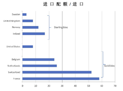 固守金本位的国家,被迫采取更为严厉的贸易保护的措施。而放弃金本位的国家采取也会采取贸易保护措施,但相对较松。对比采取两种不同政策国家的进口配额/进口额,可以明显看出,放弃金本位的经济体其进口配额的比重更低。