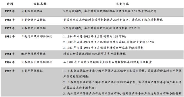 日本被迫签署多项出口限制协议。由于出口和经济增长对美国的依赖程度较高,日本在与美国的贸易争端中一直处于被动地位。由于在GATT框架下进口国无法通过提高关税限制进口,因此,在早期与美国的贸易摩擦中,日本主要是通过“自主限制”自身相关行业产品的出口数量,来缓解来自美国方面的压力。从50年代中后期到80年代后期,日本分别在纺织、钢铁、汽车、纤维、机床、半导体等众多行业签订了自愿出口限制协议。
