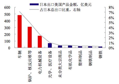 1)对日本汽车、锅炉等机械、电力机械设备(HS编码)等出口可能会产生一定的不利影响,三者占到日本对美出口的72.9%,占日本总出口的14.7%;