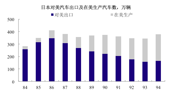 为规避出口限制,日本企业选择对美直接投资,转移产能。为了应对出口限制,80年代起,日本企业加大了对发达国家的产能投资,从而通过销售目的国自产自销的方式绕过出口限制协议,如这一时期日本汽车行业对美直接出口出现明显下降,但同时通过在美生产而实现销售的汽车数量则抵消了出口的下降。此外,1985年后日元快速升值也进一步加快了日本对外直接投资的步伐。