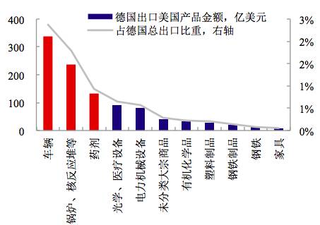 2)对德国的汽车、锅炉等机械和药剂出口可能影响较大,三者占到德国对美出口的53.5%,占德国总出口的5.1%。